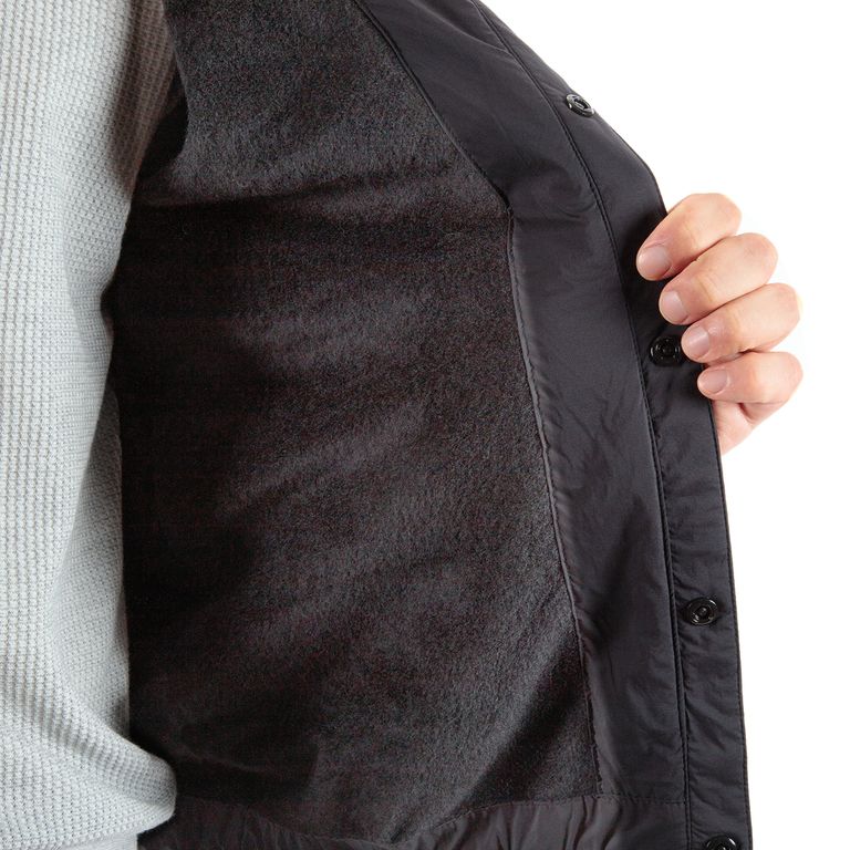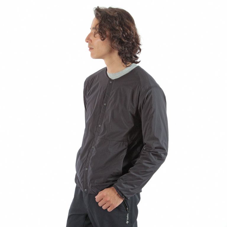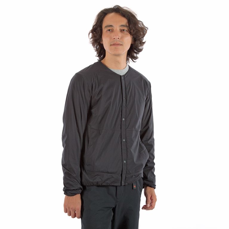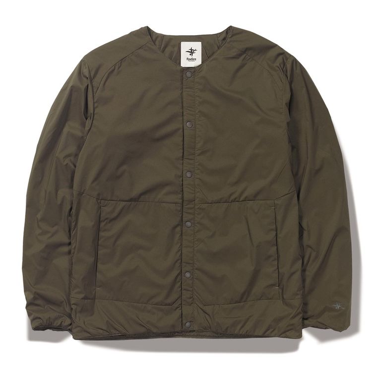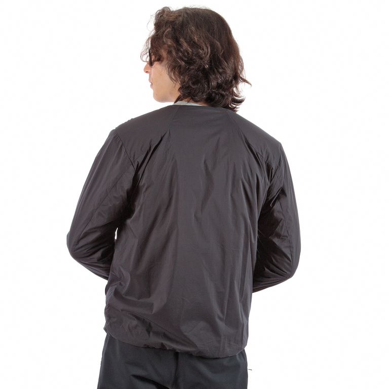 通気性コーティングを施した薄手のストレッチタフタの表地に、中綿と裏地を一体化した高機能トリコット生地「オクタCPCP」をライニングした、ノーカラーデザインのウィンドシェルジャケット。