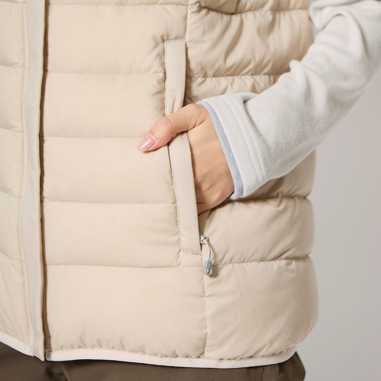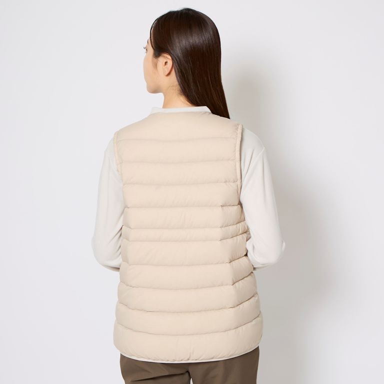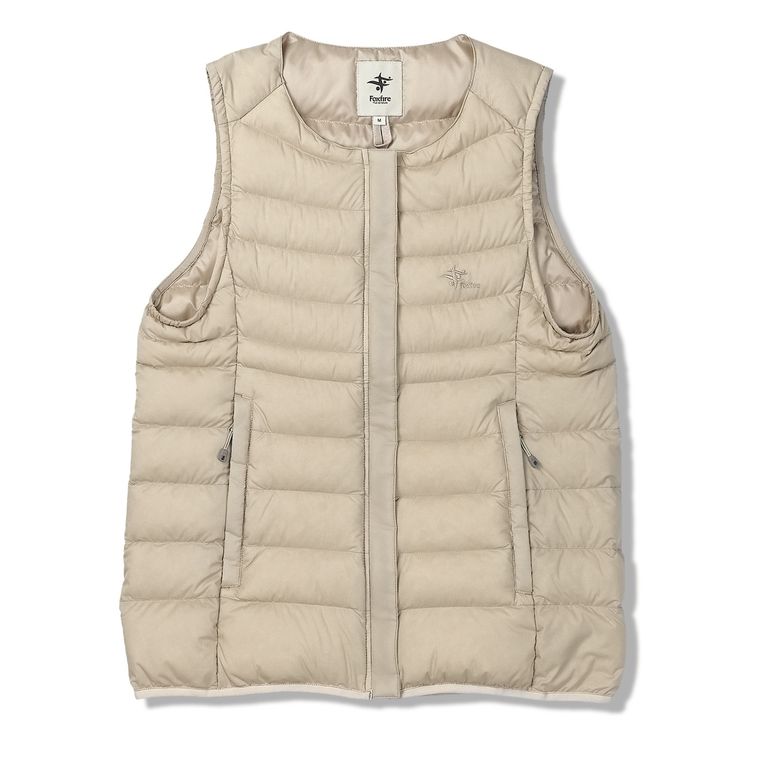 落ち着きのあるマットな質感のウーリータイプの表地と、特殊断面構造により羽毛が吹き出しにくいピスティルファイバー裏地に、米国アライド社精製による700フィルパワーの良質グースダウン封入した、ノーカラーデザインの高品質ダウンベストです。