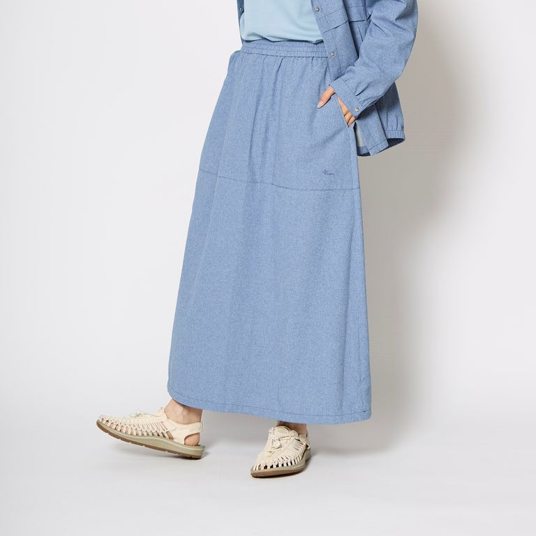 防虫、吸汗速乾、UVカット機能を持つトランスウェット・スコーロン素材に、通気性とストレッチ性も兼ね備えた軽いはき心地のスカート。シンプルなデザインとシャンブレー風の染め加工でスタイリングの幅が広がります。