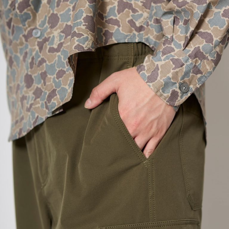 盛夏の着用も考慮し、薄さとストレッチ性を重視した生地を採用しました。ゆったりとしたシルエットのためシーンを選ばずに着用できます。裾には調節可能なアジャスターが付属。全7個(前3個、サイド2個、後ろ2個)のポケットで収納力に優れています。