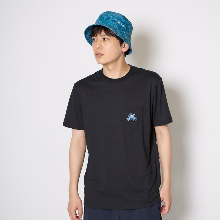 左胸のポケットに配したルリカケスをモチーフにした刺しゅうがワンポイントになっています。